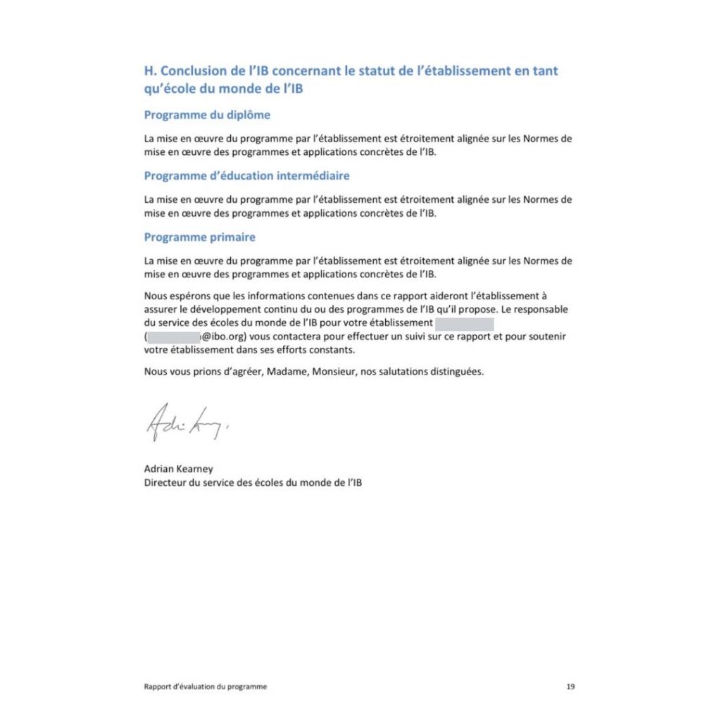 Lors de cette visite, les trois programmes de l’IB que nous proposons ont été évalués :
